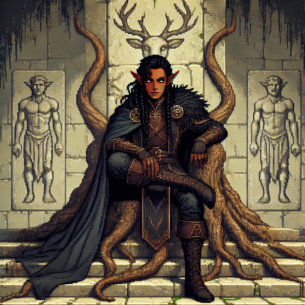 The seats were filled with elves wearing cloaks colored like the forest itself, all of them passing leather sacks of drink between them. In front of her, sitting on a throne of twisted roots, was a wood elf with skin like weathered bark. His light brown eyes reflected the dim light filtering through the Green Sea's canopy. His hair was tied up, but long braided strands cascaded down to his shoulders. He was lean, but she couldn't discern much about his build under the cloak and dark armor.